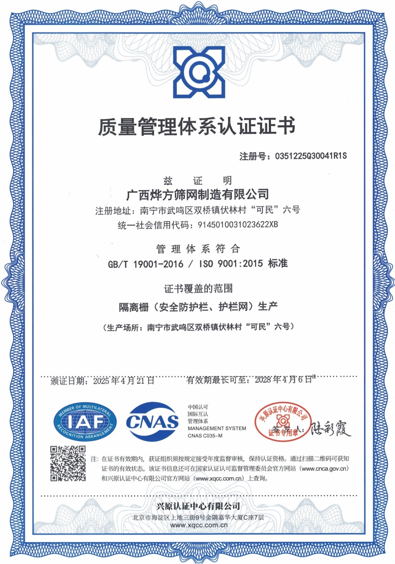 111 廣西燁方篩網制造有限公司-質量管理體系認證!
